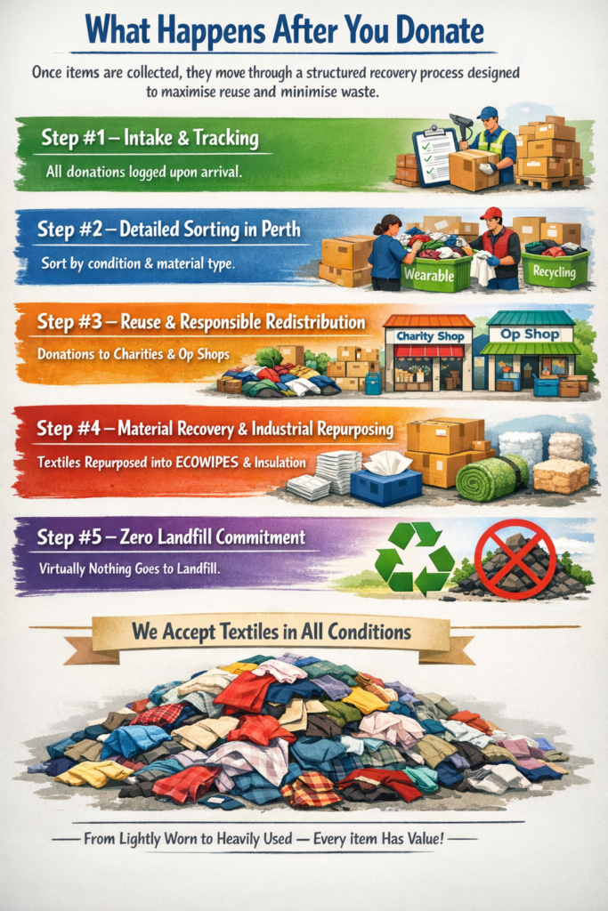 Everything you donate is tracked, sorted in Perth, and either reused, upcycled into industrial wipers (ECOWIPES), or responsibly recycled; never left to pollute our beaches or landfills.